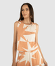 Seu design dinâmico apresenta formas geométricas irregulares que se assemelham a estrelas ou explosões, criadas a partir de triângulos e trapézios que se interligam e se alternam em tons de laranja pêssego claro e creme, adicionando um padrão visualmente interessante. Esta regata de viscose é sinônimo de leveza e respirabilidade, sendo ideal para o verão e ocasiões casuais. A combinação de viscose com elastano garante não apenas um toque macio, mas também maior flexibilidade e adaptação ao corpo, elevando o nível de conforto diário.