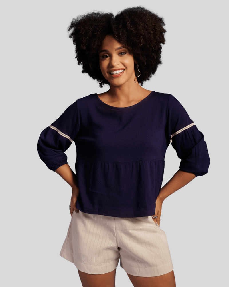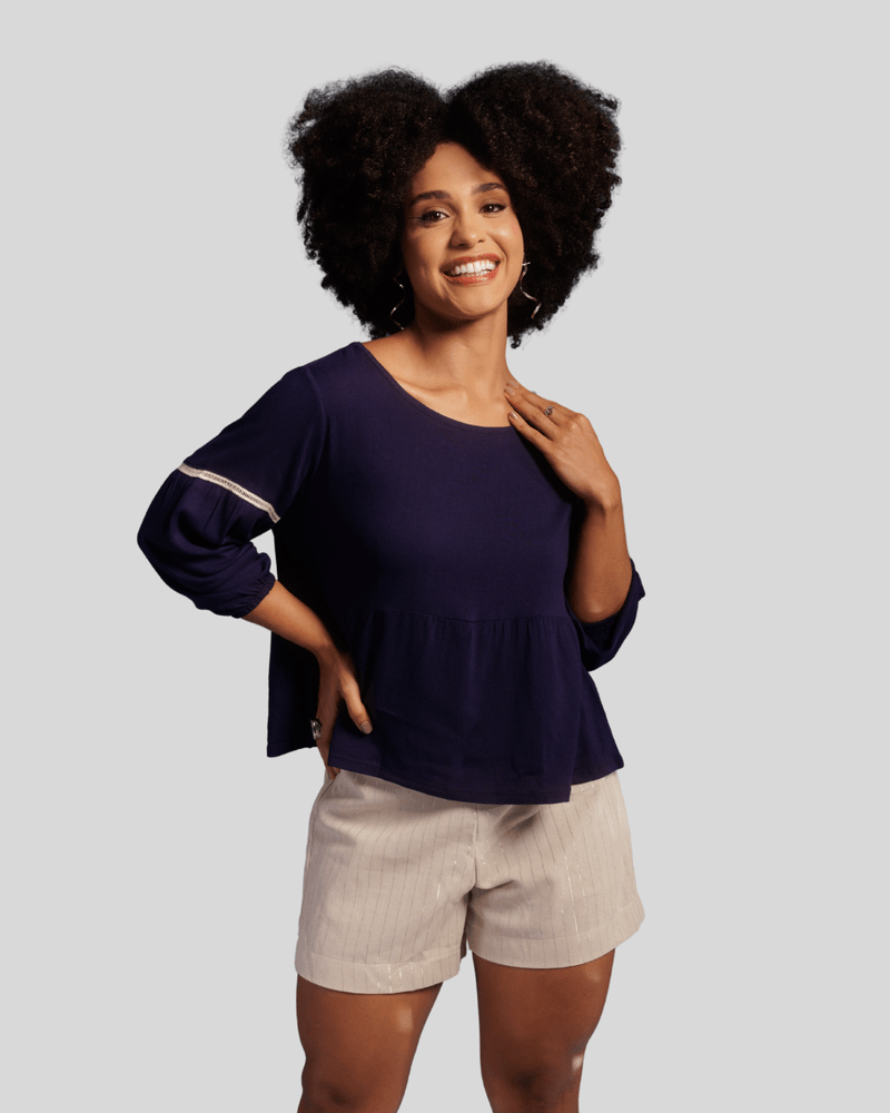 Confeccionada com uma composição de 97% Viscose e 3% Elastano, a bata garante flexibilidade e respirabilidade, adaptando-se perfeitamente ao corpo. O design se destaca pelas mangas três quartos com um charmoso detalhe bufante nos punhos, adornado por uma fita ou renda clara, que adiciona um toque de sofisticação. O decote redondo e a cintura marcada, com uma barra em estilo peplum, valorizam a silhueta de forma elegante.