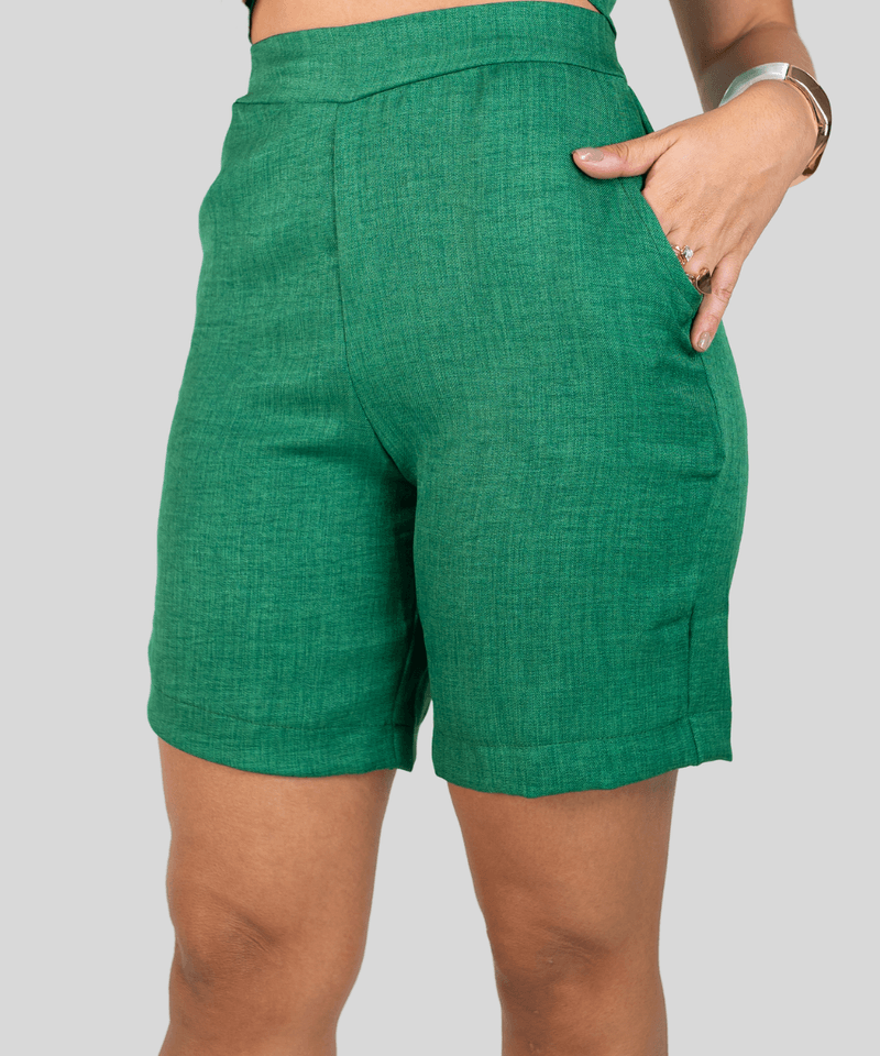 Pensada para o bem-estar e a praticidade, a bermuda com elástico conta com um cós traseiro com elástico, que proporciona um ajuste perfeito ao corpo e maior liberdade de movimentos. Os bolsos laterais tradicionais adicionam funcionalidade e um toque clássico ao design, tornando-a uma peça versátil e indispensável no guarda-roupa feminino.