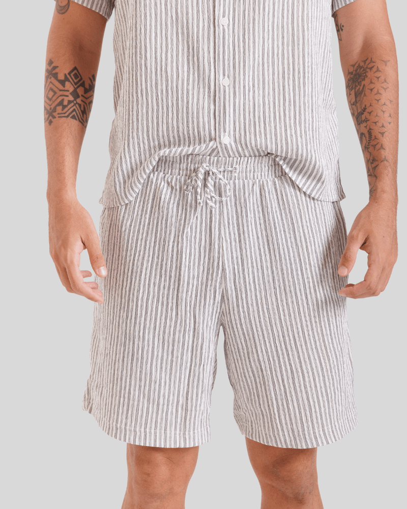 O tecido da bermuda possui uma textura levemente amassada ou enrugada, adicionando um detalhe visual único e um toque de originalidade à peça. Este atributo confere um aspecto despojado e confortável, perfeito para os dias mais quentes ou para um estilo relaxado. A Bermuda Listrada AISTHY é a escolha ideal para homens que valorizam qualidade, design e bem-estar em cada detalhe, sendo uma Roupa Masculina Moderna com Listras Verticais. Confeccionada em 100% algodão para maior conforto e durabilidade.