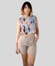 Versatilidade Cromática: A cor cáqui é extremamente fácil de combinar, funcionando bem com cores vibrantes (como a estampa azul e laranja da foto), tons terrosos ou o clássico branco.