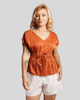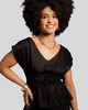 O modelo apresenta um charmoso decote em V na parte frontal e mangas curtas e soltas, que remetem ao estilo morcego ou japonês, adicionando um ar despojado e sofisticado. A cintura é elegantemente marcada por um elástico e um cordão do mesmo tecido, que pode ser amarrado em um laço, criando um efeito de franzido e ajuste personalizado. A parte superior é ampla e fluida, contrastando com a parte inferior que possui um caimento mais solto, finalizando em uma leve bainha. Disponível nos tamanhos P ao GG, a Blusa Atrevida Xis é um diferencial no guarda-roupa.