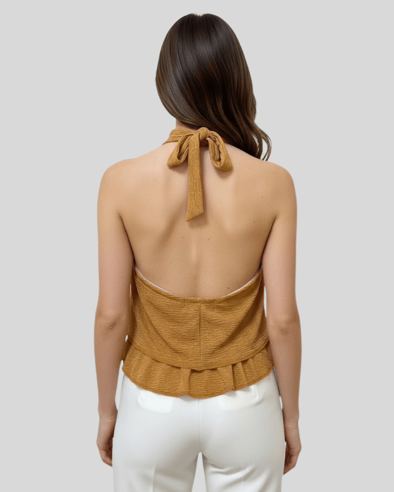 O design inovador da blusa inclui um fechamento com amarração no pescoço, que garante uma gola alta e justa, proporcionando um caimento impecável e valorizando o colo. As costas quase totalmente nuas adicionam um elemento de sensualidade e modernidade à peça, tornando-a uma escolha audaciosa e elegante. O tecido leve e de ótimo caimento, com suas pequenas ondulações horizontais, confere um aspecto creponado sutil, garantindo conforto e movimento.