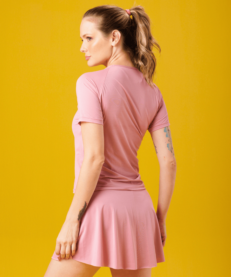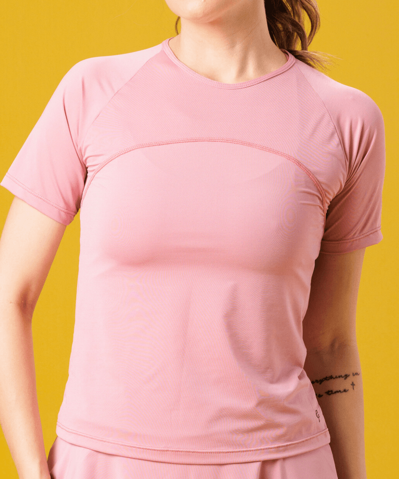 Com um design pensado para o corpo feminino, a blusa apresenta um decote redondo clássico e mangas raglã que proporcionam maior liberdade de movimento. Seus recortes estratégicos são evidenciados por costuras diagonais que se estendem do decote até as axilas, complementadas por uma costura horizontal sutil na altura do peito. O tecido, na delicada cor Quartzo (rosa claro), possui um padrão texturizado quase imperceptível, adicionando uma trama suave e um toque de sofisticação à peça.