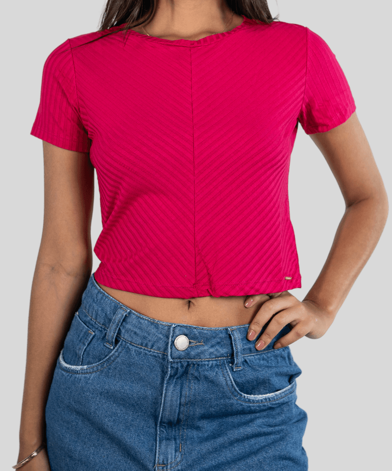 Blusa Cropped de Malha Canelada Blusa feminina estilo cropped, confeccionada em malha canelada que destaca a textura e proporciona um toque moderno à peça. Possui manga curta e gola redonda, garantindo um visual casual e despojado. Produzida com tecido leve de viscose e elastano, oferece conforto, elasticidade e caimento ajustado ao corpo. Ideal para compor looks urbanos, combinando com peças de cintura alta, como jeans, saias ou shorts.