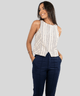 O visual moderno e despojado é garantido pela estampa de listras irregulares em tons neutros. Um detalhe traseiro com uma faixa tipo cinto permite um ajuste personalizado na cintura, assegurando um caimento perfeito e muito conforto. O decote reto complementa o design, valorizando o colo com discrição e sofisticação, tornando-a uma peça-chave para o verão e uma versátil Regata Feminina.