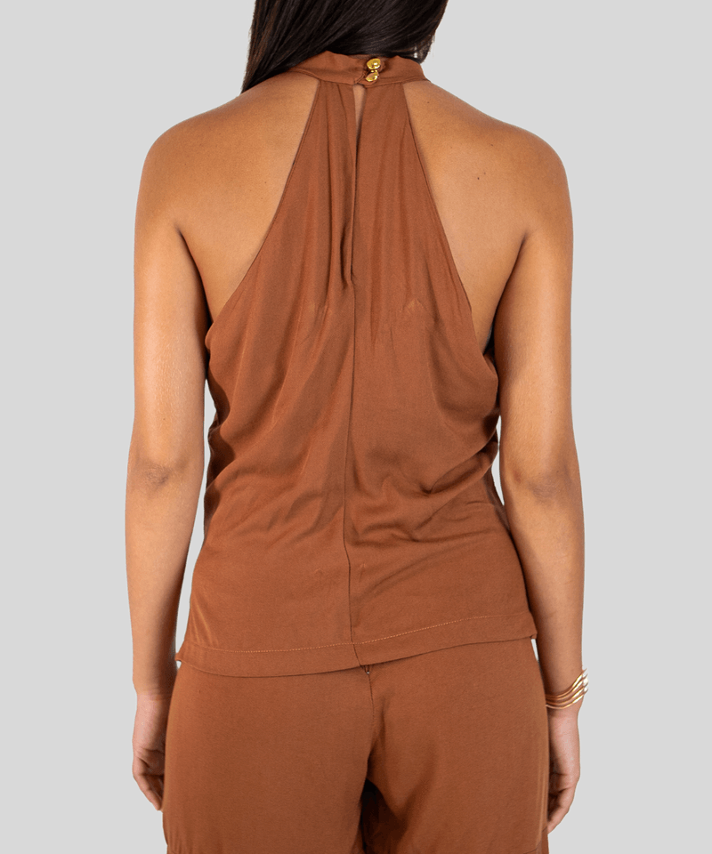 Tipo de Gola: Gola Alta com fechamento por botões na parte de trás