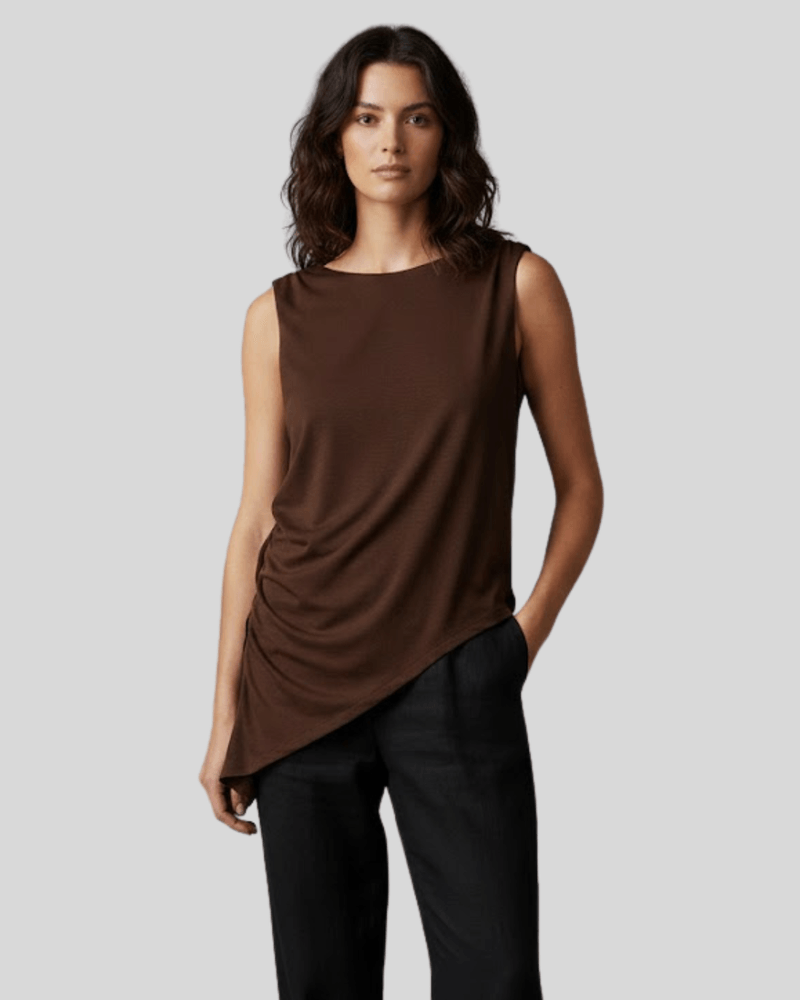 Blusa Feminina Moda Loka Assimétrica com Drapeado Lateral – Marrom Café