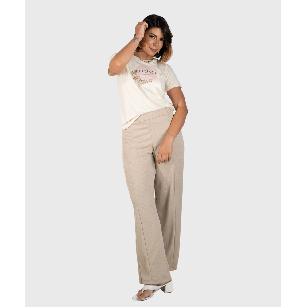O grande diferencial desta blusa é a sua estampa frontal tropical, que exibe a palavra 'Tropical' em destaque. A estampa é detalhada, apresentando um círculo de tonalidade rosa claro ou bege pálido, sobre o qual elementos em cor dourada ou metálica se destacam. A palavra 'TROPICAL' aparece em letras maiúsculas e brilhantes, acompanhada de 'essência natural' em fonte cursiva e 'CEREJA ROSA' em letras menores, todos em dourado. Complementando o design, há a ilustração de uma planta com um sofisticado acabamento em alto-relevo brilhoso, uma folha estilizada com veias bem definidas, também em dourado e com brilho metálico, estendendo-se do canto inferior esquerdo do círculo, adicionando um charme extra e um toque de elegância ao visual da roupa feminina.