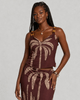 • Estampa Tropical Chic: Apresenta desenhos de coqueiros estilizados em tom bege sobre um fundo marrom terroso, criando um visual orgânico e muito atual.