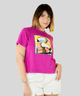 O grande diferencial desta peça é a sua estampa exclusiva em silk de tucano, que adiciona um toque tropical e moderno. A blusa, predominantemente na cor fúcsia ou rosa vibrante, apresenta uma estampa retangular centralizada em fundo amarelo. Dois tucanos estilizados com bicos grandes em tons de branco, azul claro, amarelo e laranja, e corpos adornados com padrões geométricos e pontilhados em diversas cores, incluindo laranja, rosa, azul, preto e branco, criam um visual único. Com gola redonda canelada e mangas curtas, a blusa oferece praticidade e é ideal para compor looks descontraídos e cheios de personalidade.