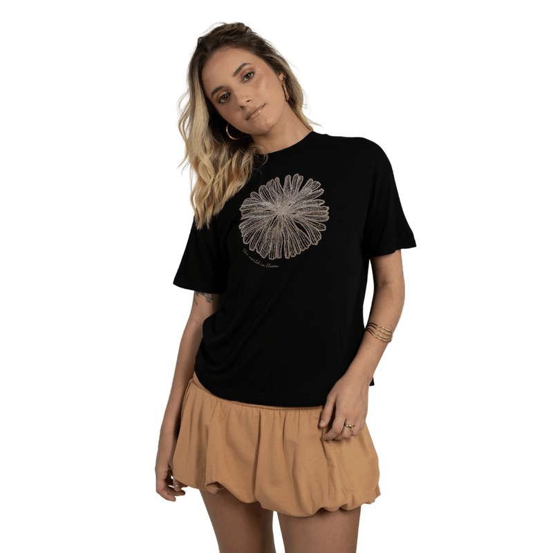 Confeccionada pela renomada marca ROVITEX, esta blusa combina a leveza e o toque suave da viscose (98%) com a flexibilidade do elastano (2%). Essa composição garante um conforto superior e um ajuste perfeito ao corpo, permitindo liberdade de movimento. A estampa, descrita como uma flor estilizada em preto com o texto "the world in bloom", confere um charme único à peça, tornando-a versátil para diversas ocasiões.