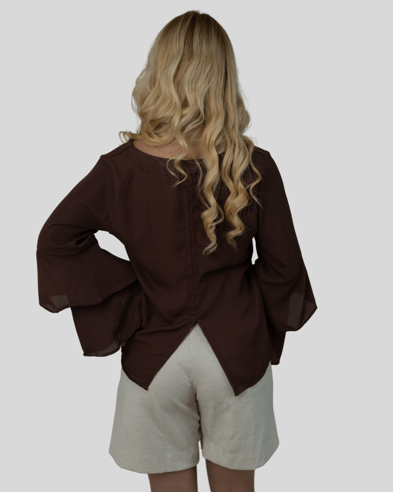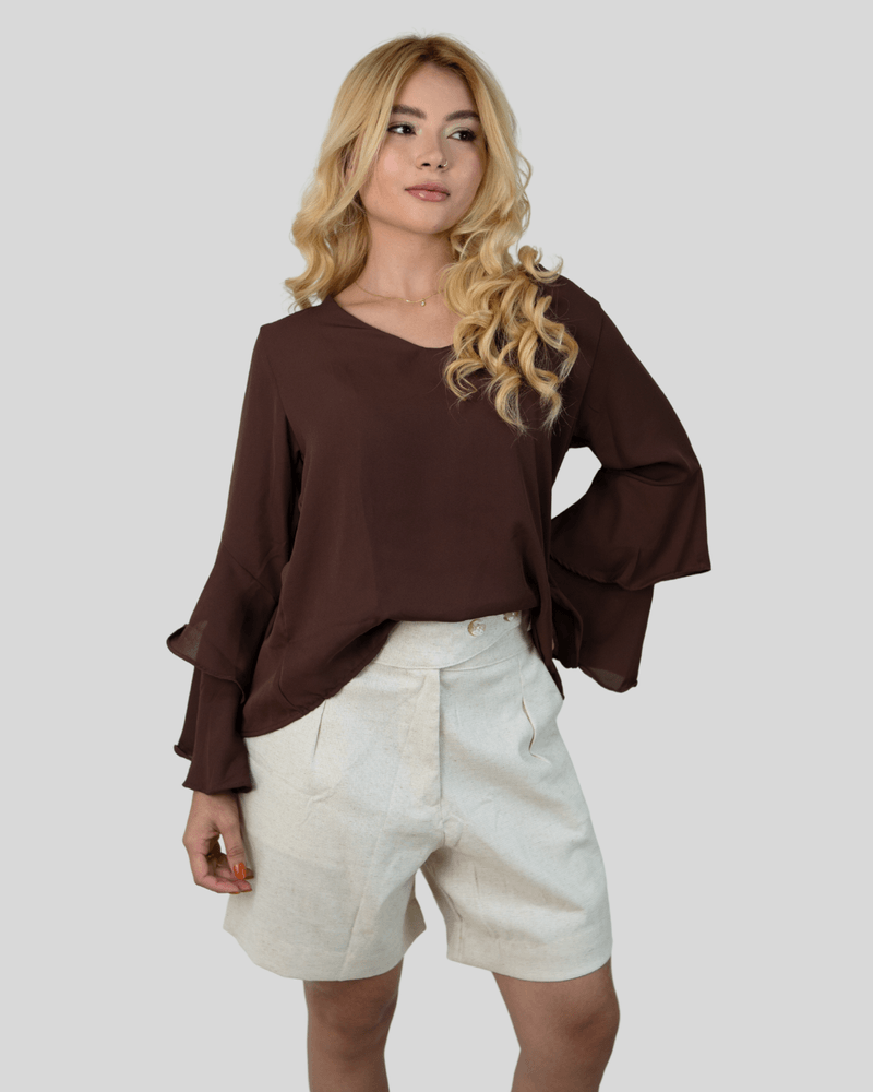 O design da Blusa Ana Xis se destaca pelo seu decote em V, que confere um toque de feminilidade e alonga a silhueta. As mangas longas são um verdadeiro diferencial, apresentando detalhes em camadas ou babados duplos que se alargam em direção aos punhos, criando um charmoso efeito de manga sino ou flare. A cor marrom escuro predominante adiciona versatilidade e sofisticação ao seu guarda-roupa, tornando-a uma blusa marrom indispensável.
