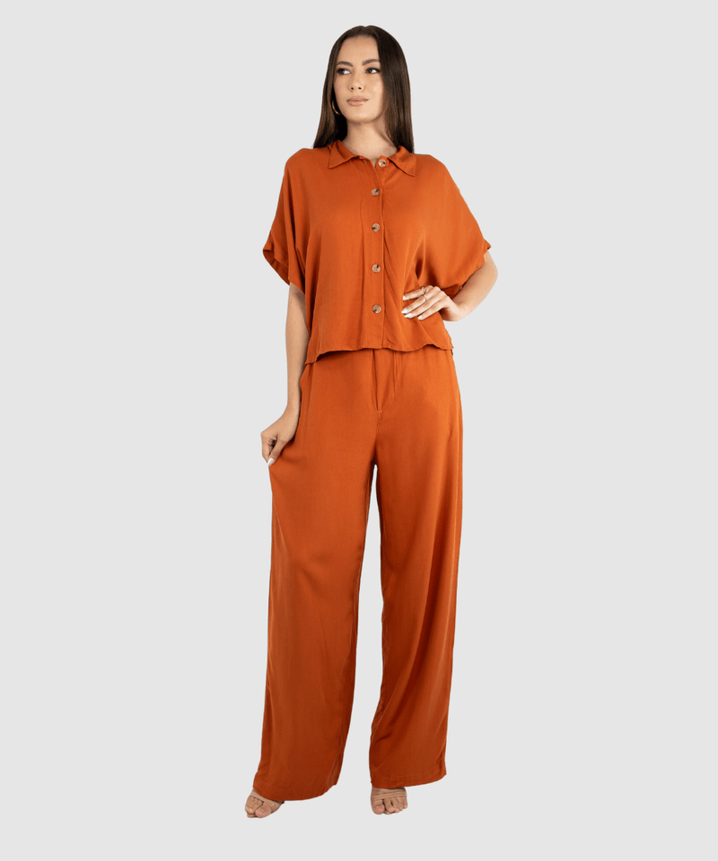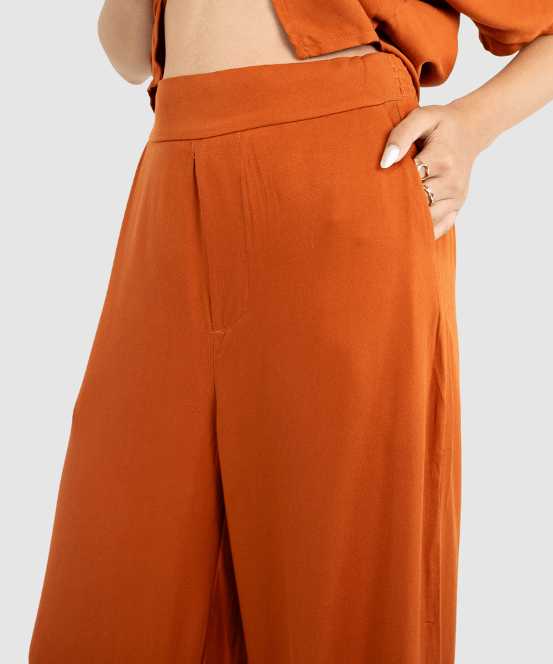Modelagem pantalona com caimento leve Tecido em viscose, fresco e confortável Cós sem fechamento, com elástico na parte de trás Bolsos funcionais apenas na frente Ideal para produções casuais e elegantes