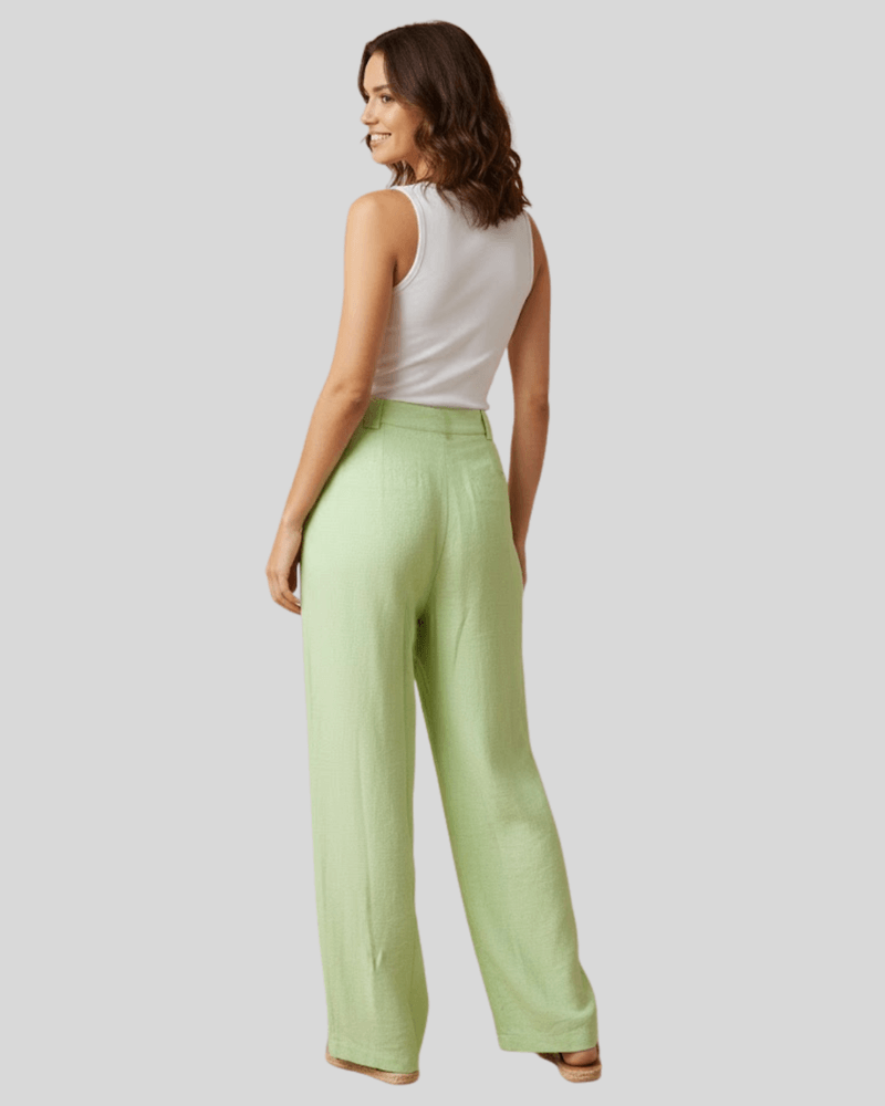 - Detalhes: Pernas largas, pregas frontais, passantes na cintura, bolsos laterais