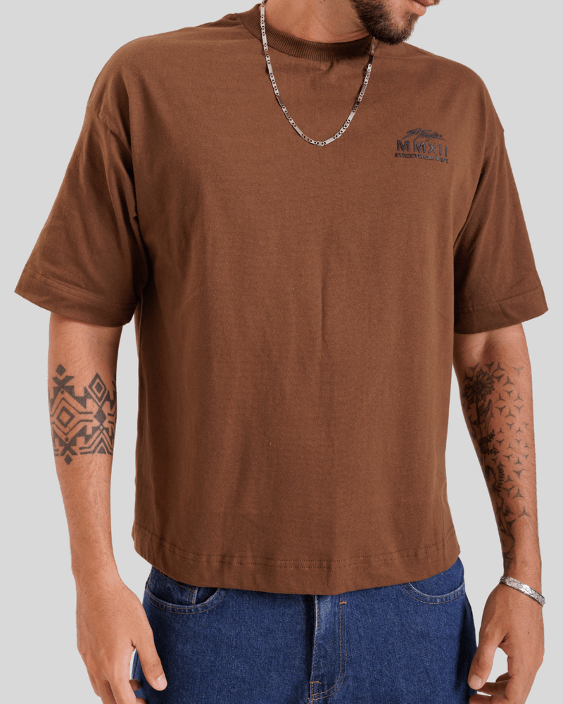 Confeccionada em 100% Algodão, a camiseta garante toque macio e conforto superior durante todo o dia, além de excelente respirabilidade. Seu design inclui mangas curtas e gola redonda, elementos clássicos que se unem à estampa exclusiva no lado esquerdo do peito. Esta camiseta masculina estampada, na cor marrom, apresenta a inscrição 'MMXXII' e um elemento gráfico que remete a montanhas ou uma paisagem estilizada, adicionando um toque de originalidade e personalidade à peça.