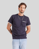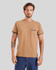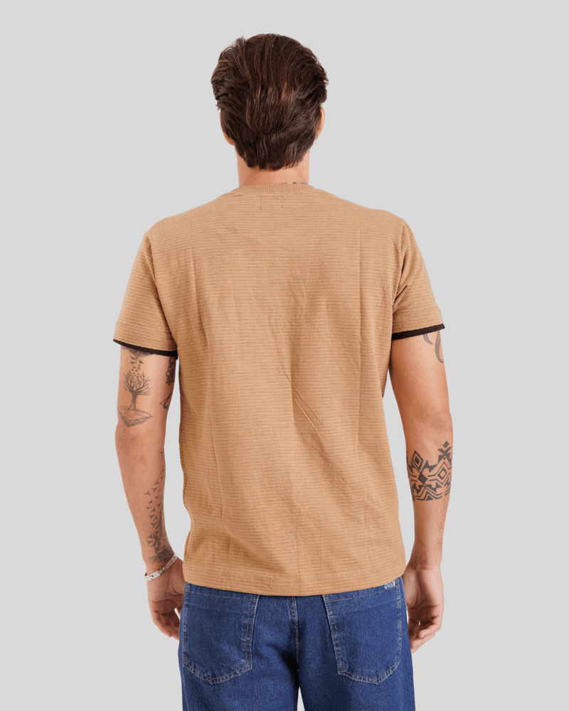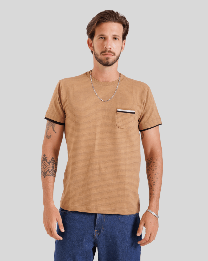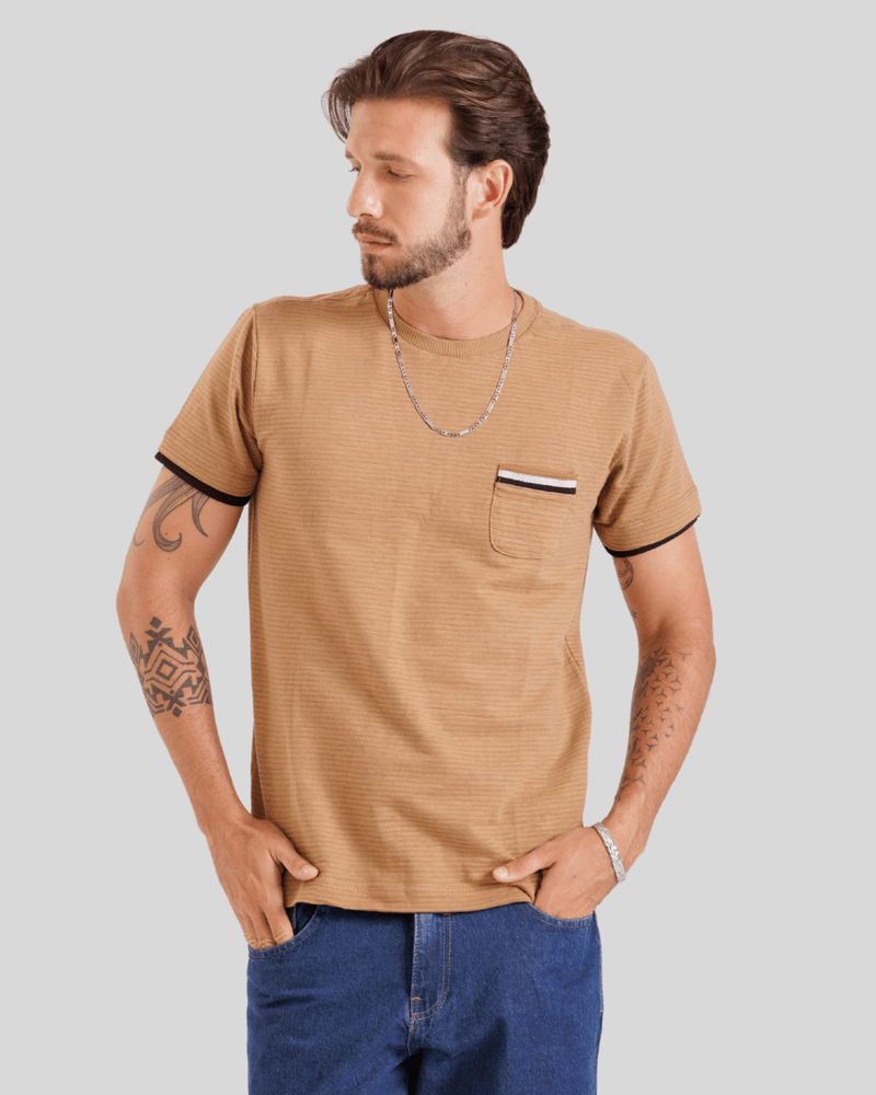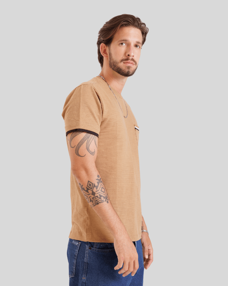 Com um design cuidadosamente elaborado, a camiseta apresenta uma cor predominante em tom de marrom claro ou bege, complementada por um padrão de listras horizontais finas e sutis em relevo por toda a sua superfície. As mangas curtas possuem um acabamento diferenciado na barra, com uma faixa preta que adiciona um contraste moderno. No lado esquerdo do peito, um prático bolso utilitário se destaca, acompanhado por um detalhe decorativo de três listras horizontais (preta, branca e preta mais fina) acima, conferindo um toque exclusivo à peça.