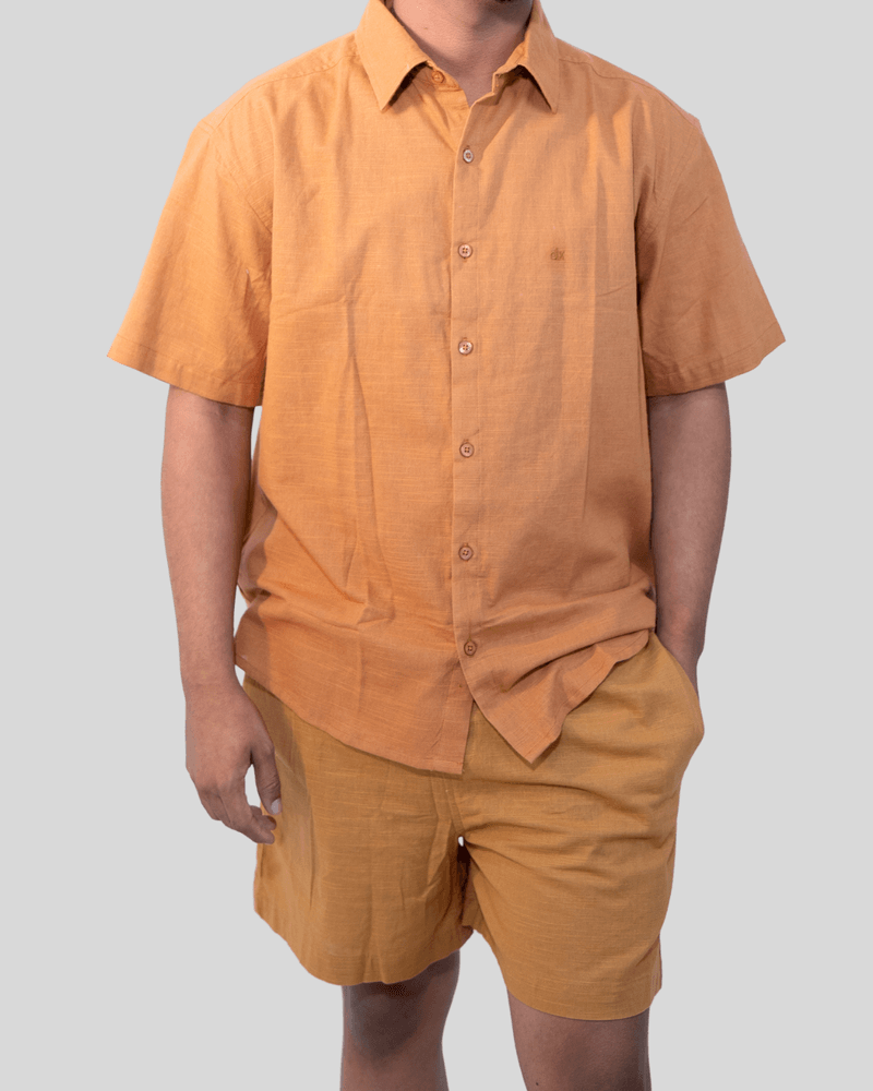 Seu design de mangas curtas e gola estruturada transita facilmente entre um evento casual à beira-mar e um compromisso urbano. O fechamento frontal por botões personalizados e o bordado discreto do logo "dx" no peito reforçam a identidade de uma peça premium com acabamento impecável. Em uma tonalidade mostarda moderna, esta camisa é a escolha ideal para homens que não abrem mão de estilo e praticidade.