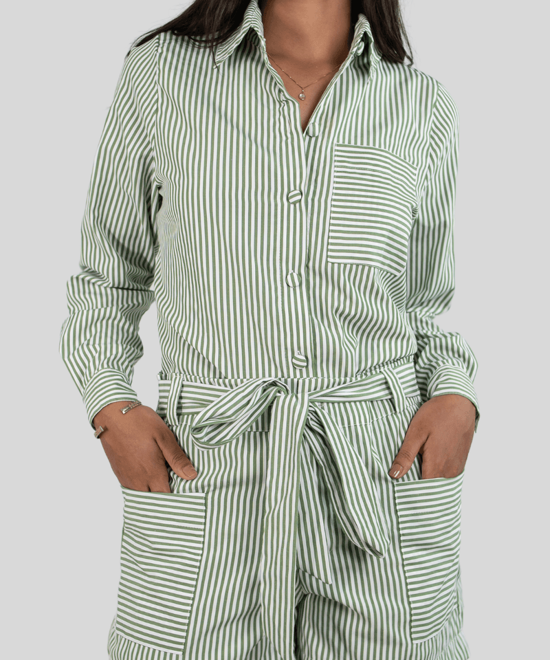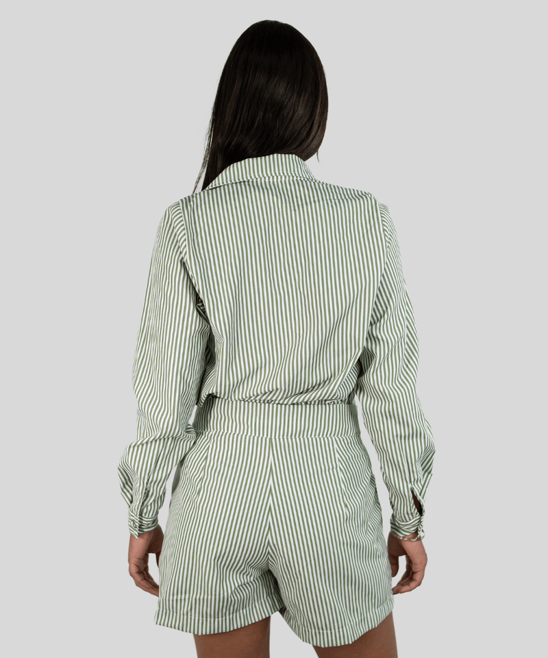 O modelo conta com estampa listrada clássica, gola estilo polo e fechamento frontal por botões. Os detalhes nos punhos também trazem botões funcionais, adicionando um toque refinado à peça. Possui bolso prático na região do peito, que complementa o design moderno e funcional.