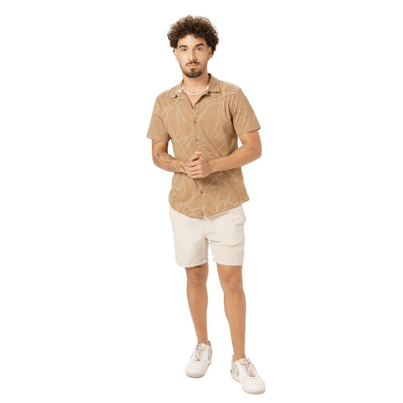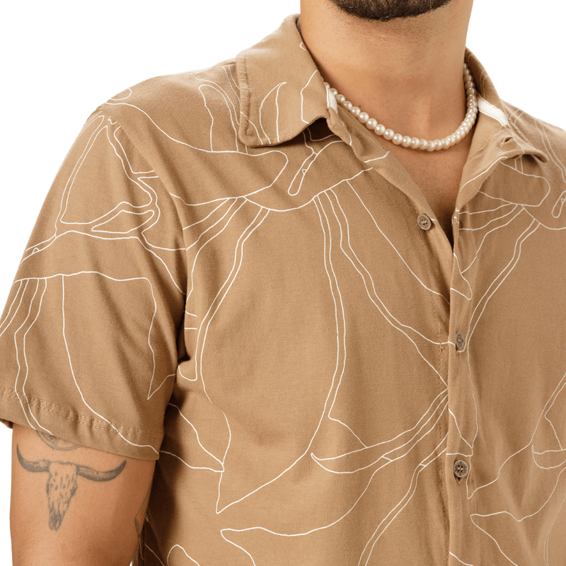 Confeccionada em 100% Algodão, a peça garante um toque suave à pele e excelente respirabilidade, ideal para diversas ocasiões. A estampa, que visualmente remete a contornos de folhas em contraste, é complementada por uma fileira de botões circulares na parte frontal, que parecem ser de tonalidade clara, como bege ou marrom claro, conferindo um acabamento sofisticado.