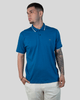 O design clássico da camisa apresenta uma gola polo com nervuras, adornada por duas finas listras horizontais nas bordas, sendo uma branca e outra em tom escuro (possivelmente azul-marinho ou preto), conferindo um visual sofisticado. A carcela frontal possui dois botões brancos e redondos, enquanto as mangas curtas contam com punhos também nervurados e com as mesmas listras, harmonizando com a gola. Um pequeno emblema bordado em cor escura no lado esquerdo do peito adiciona um toque de exclusividade à peça, que se apresenta na cor verde-água escuro (ou azul-petróleo) com detalhes em branco e escuro.