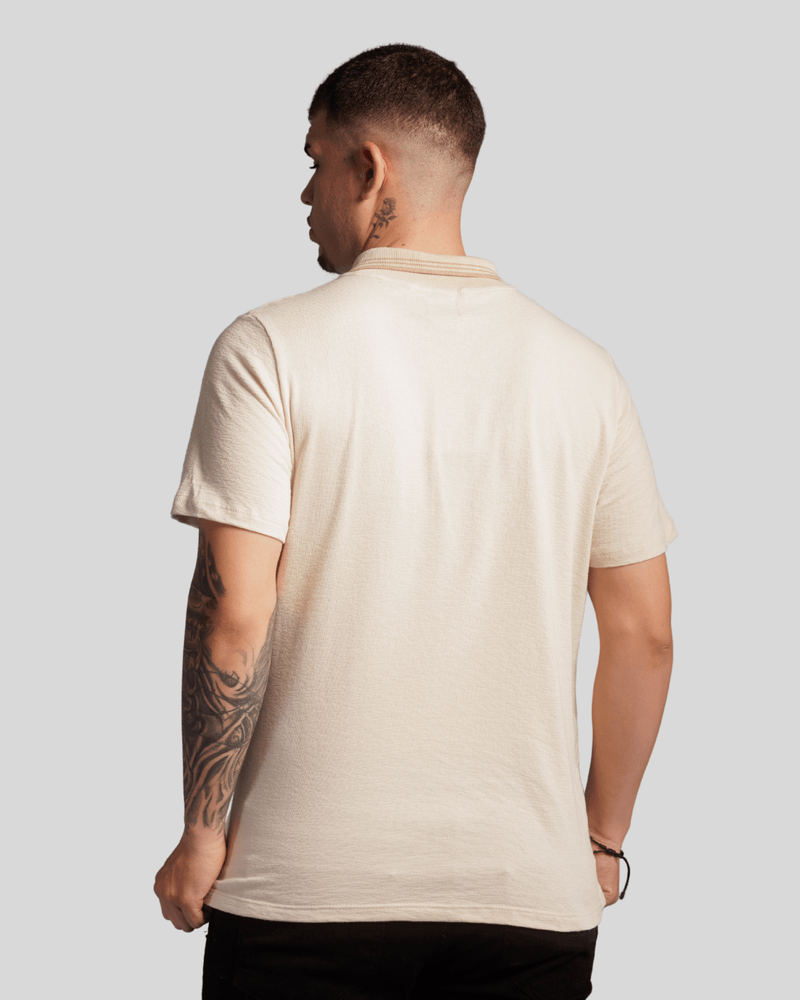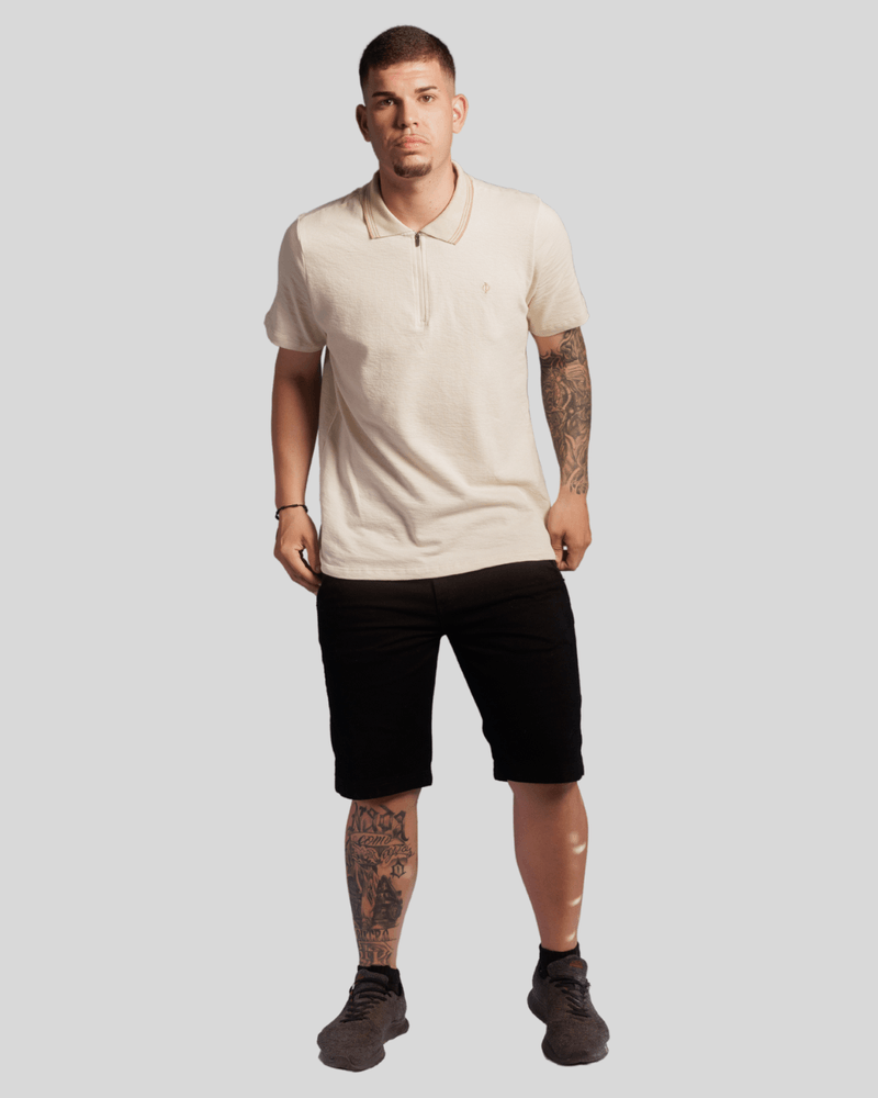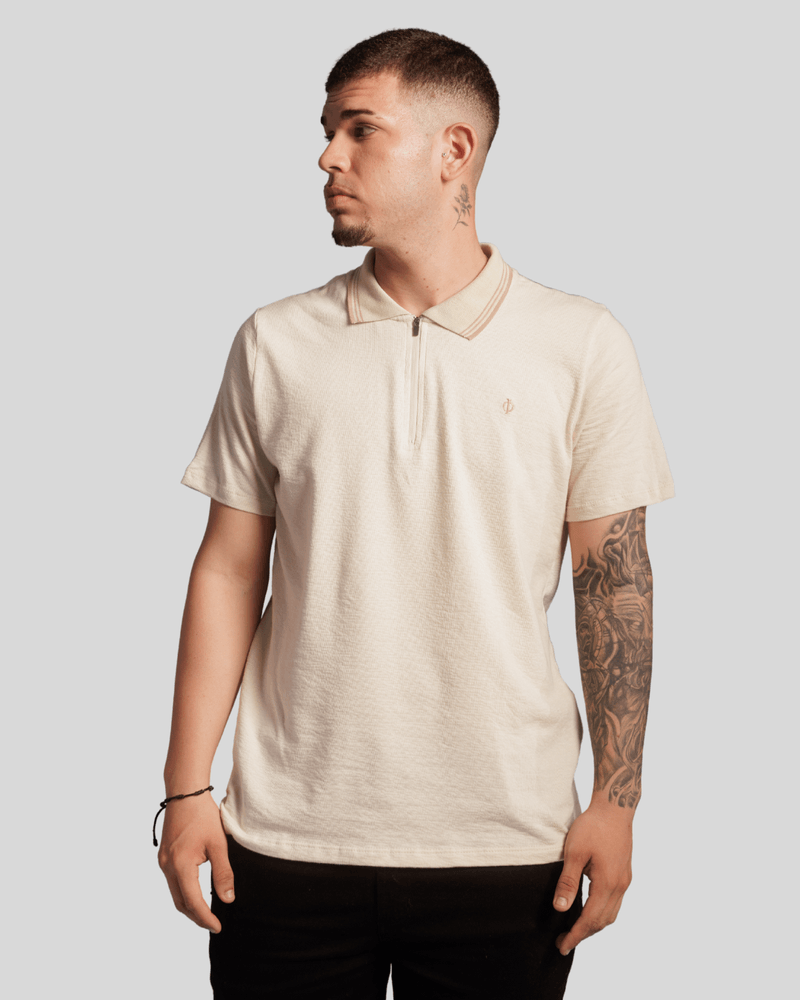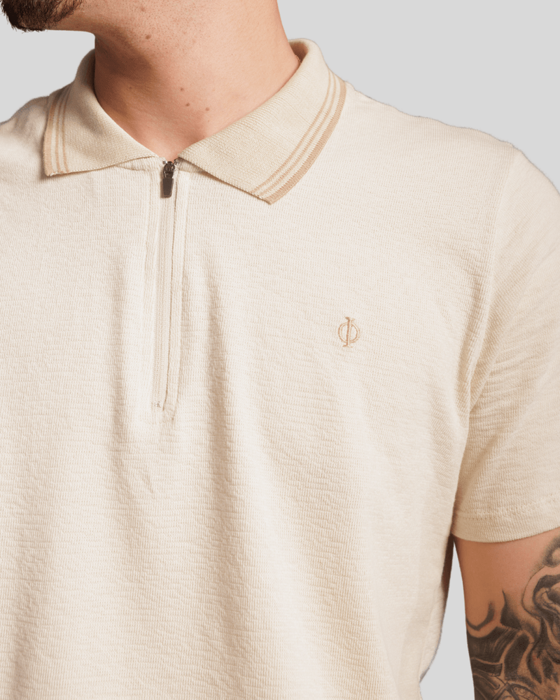O design moderno da camisa apresenta uma elegante gola polo, realçada por uma fina linha na borda em tom avermelhado ou marrom claro, adicionando um toque de sofisticação. A abertura frontal é prática e estilosa, com um zíper escuro que se estende do colarinho para baixo, permitindo ajuste personalizado. No peito esquerdo, um pequeno emblema escuro e discreto complementa o visual. A cor creme ou off-white da camiseta, combinada com mangas curtas, confere um ar casual e versátil, tornando-a ideal para diversas ocasiões e fácil de combinar com outras peças do vestuário masculino. Seu tecido de algodão proporciona conforto térmico e liberdade de movimento.