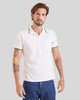 O design da camisa apresenta uma cor branca clássica com detalhes em preto contrastante na gola e nas mangas curtas, adicionando um toque de sofisticação. A gola polo possui uma abertura frontal discreta, em formato de V, sem botões visíveis, e um fino contorno preto que realça seu formato. As mangas curtas são finalizadas com uma faixa preta fina na barra, complementando o visual moderno da peça. No lado esquerdo do peito, um prático bolso chapado retangular com um pequeno detalhe escuro no canto superior direito adiciona funcionalidade e um detalhe estiloso.