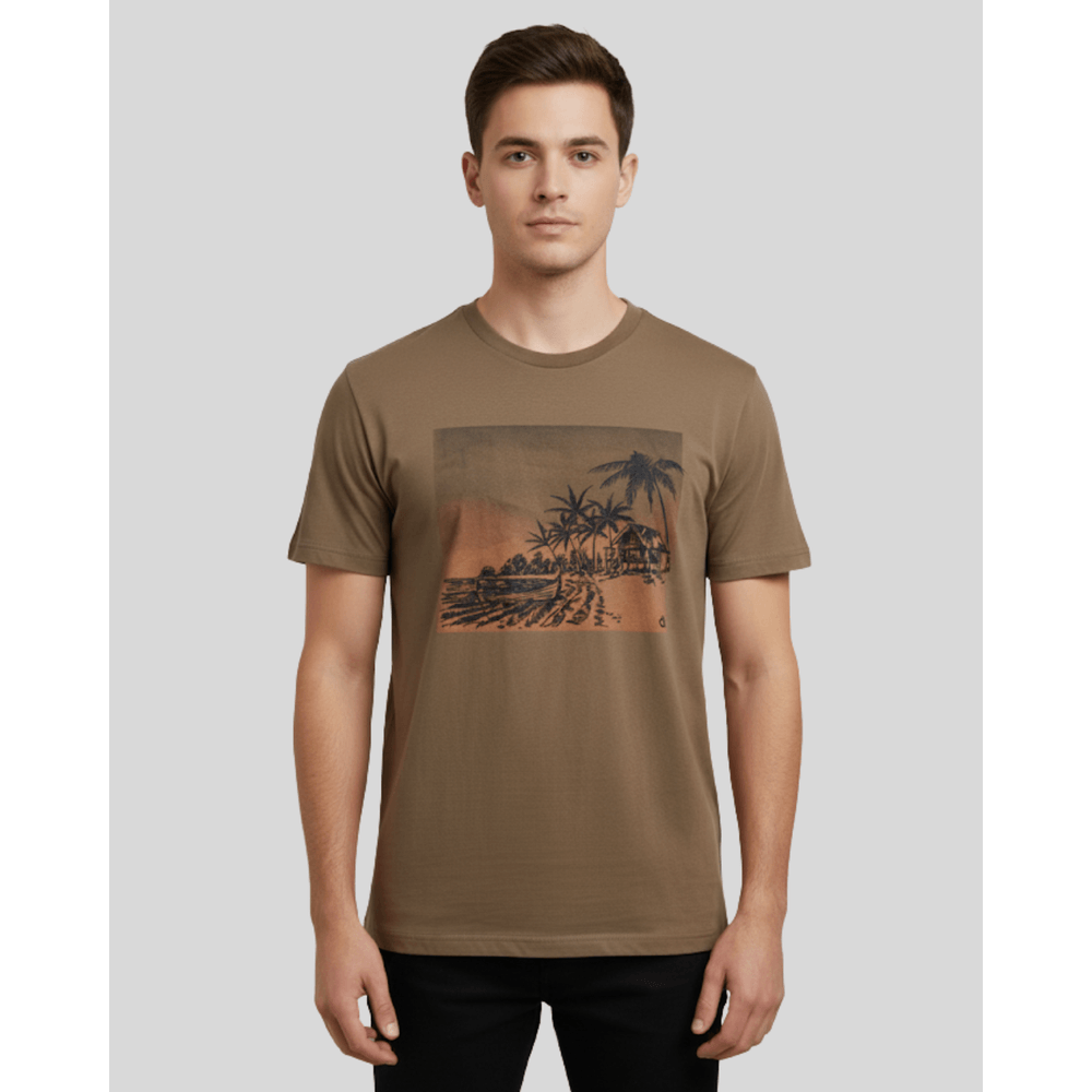O destaque fica por conta da estampa frontal em leve relevo, que traz uma paisagem praiana em estilo artístico, conferindo um ar descontraído e moderno. A gola careca canelada garante um ajuste confortável, enquanto a modelagem casual facilita combinações com bermudas, calças ou shorts.
