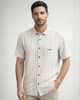 Gangster destaca-se por sua estética clean e atemporal, apresentando uma padronagem clássica de listras verticais finas em contraste com o fundo off-white. O tecido possui um visual que remete à sofisticação do linho, garantindo uma aparência nobre para o dia a dia.