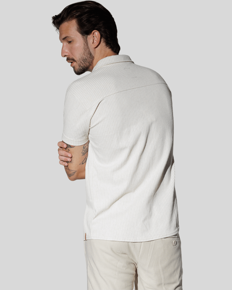 Confeccionada com uma composição inteligente de 54% Poliéster, 44% Algodão e 2% Linho, a camisa proporciona um toque suave e uma excelente respirabilidade. O padrão sutil de listras verticais em tons claros e neutros adiciona um charme discreto, enquanto o colarinho aberto e o abotoamento frontal com botões discretos complementam o estilo. Com caimento solto e mangas curtas, garante liberdade de movimento e bem-estar durante todo o dia.
