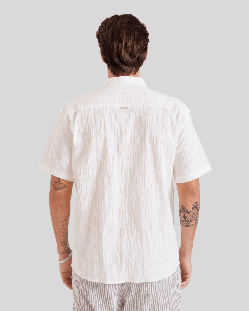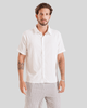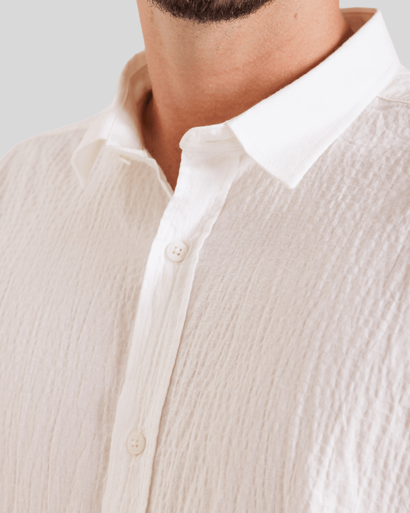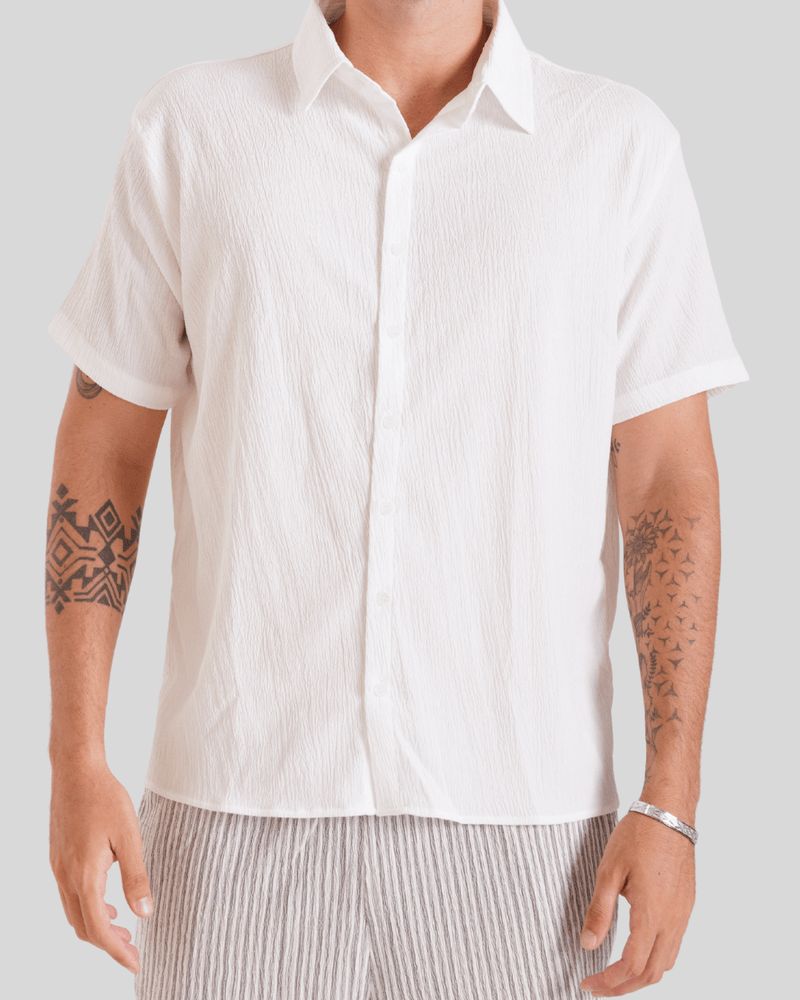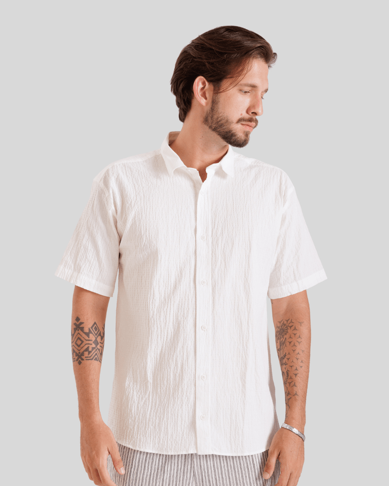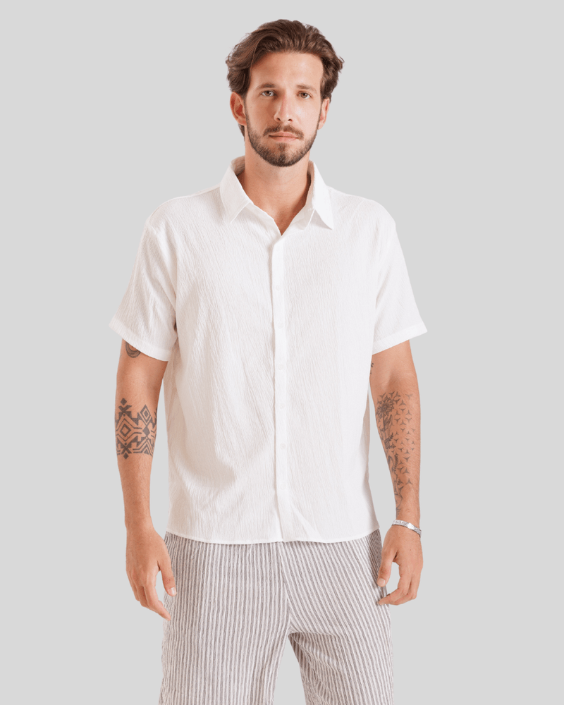 Com um design que evoca um visual descontraído, a camisa possui uma gola clássica e abotoamento frontal completo com botões claros, complementando seu aspecto único. Seu caimento solto e as mangas curtas a tornam ideal para diversas ocasiões do dia a dia, desde passeios casuais até encontros informais, oferecendo um estilo versátil e moderno. A textura diferenciada e a cor predominantemente branca da camisa, conforme observado nas imagens, adicionam um toque de sofisticação despojada à moda masculina.