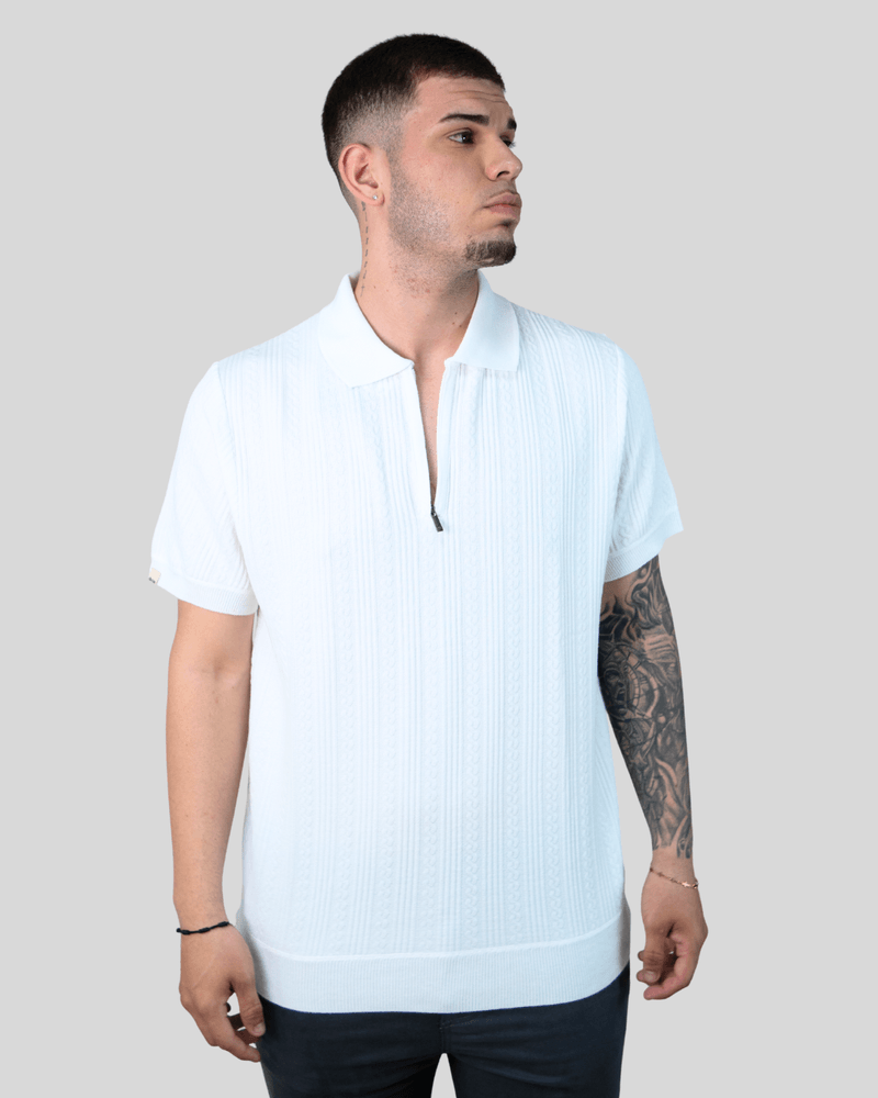 Com um visual moderno e atemporal, a Camisa Polo Dixie possui um padrão texturizado e intrincado, que remete a um trabalho de tricô ou malha com desenho de tranças, conferindo um diferencial único à peça. A gola polo clássica e a abertura frontal com zíper de cor escura adicionam um toque contemporâneo e funcional. As mangas curtas e a barra inferior apresentam acabamento canelado, complementando a estética refinada deste Vestuário Masculino Confortável. Um pequeno detalhe quadrado de cor clara, possivelmente um rótulo ou etiqueta, é visível na parte inferior da manga esquerda do usuário, reforçando a atenção aos detalhes da marca.
