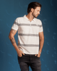 Com um design moderno e versátil, a Camiseta Gangster Fio Tinto apresenta um padrão de listras horizontais no peito e tronco, em tons escuros como cinza ou preto, sobre uma base off-white ou creme, conforme observado nas imagens do produto. A gola clássica e o fechamento frontal com zíper vertical escuro adicionam um toque de sofisticação e originalidade. Um pequeno emblema quadrangular na parte superior esquerda do peito complementa o visual, tornando-a uma escolha ideal para quem valoriza peças com identidade e acabamento diferenciado.