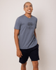 G91. Com um tom azul acinzentado versátil e moderno, esta peça se destaca pela estampa frontal gráfica de inspiração urbana. O design apresenta o logo "DVSN" emoldurado por um globo e elementos visuais que remetem à estética industrial e tecnológica.