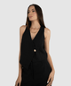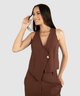 As laterais do colete são cuidadosamente detalhadas com viés, criando uma modelagem inspirada no corset que valoriza a silhueta de forma sutil e elegante. Confeccionado em um tecido leve e confortável, composto por 92% viscose e 8% poliéster, este colete de viscose oferece um caimento impecável e uma sensação agradável ao toque. Sua aparência lisa e a textura perceptível do tecido garantem um visual de alta qualidade.