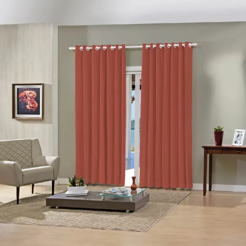 Fabricada com tecido liso 100% poliéster, a cortina oferece durabilidade e um caimento elegante. O grande diferencial é o seu forro corta-luz, composto por 100% policloreto de vinila (blackout), que assegura o bloqueio total da luz externa. A cor terracota vibrante, conforme as imagens, complementa diversos estilos de decoração, enquanto os ilhoses redondos, de cor clara, facilitam a instalação em varões, proporcionando um visual moderno e prático.