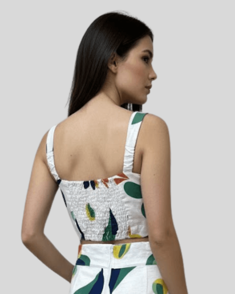 O design do cropped apresenta um elegante decote em V e alças largas, proporcionando um caimento confortável e moderno que revela sutilmente parte do abdômen. A estampa é abstrata, com formas orgânicas e arredondadas que remetem a pinceladas artísticas, em uma paleta de cores predominantemente verde (claro e escuro), azul marinho, amarelo e laranja, sobre um fundo branco. Essa combinação de cores cria um padrão dinâmico e visualmente atraente, perfeito para o verão e para compor looks alegres e despojados.