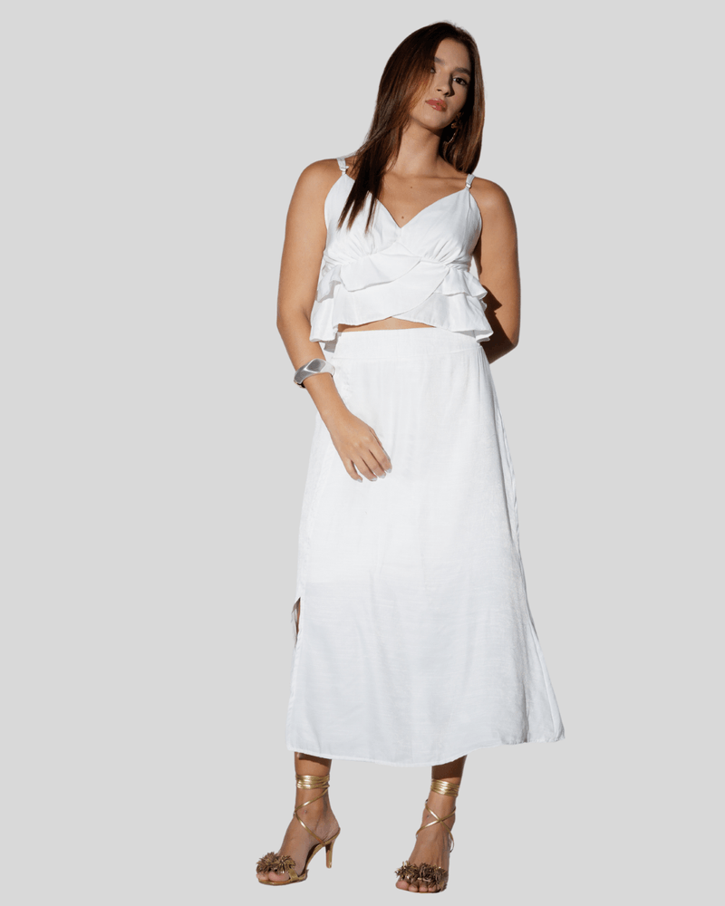 - Detalhes: Babados frontais, decote em V, comprimento cropped