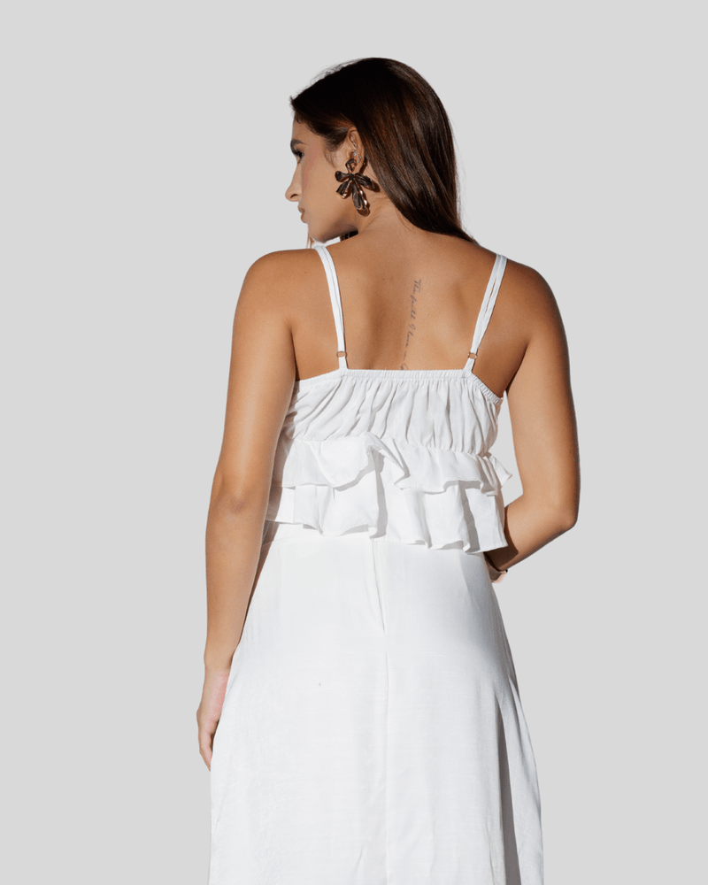Confeccionado com uma composição de 63% Poliéster e 47% Viscose, o cropped oferece um toque suave e um caimento impecável. A combinação desses tecidos garante conforto e durabilidade, além de uma leveza que proporciona bem-estar ao longo do dia. O design é enriquecido por múltiplas camadas de babados que se sobrepõem na parte frontal, criando volume e uma textura visualmente atraente. O decote em V pronunciado adiciona um toque de sensualidade e elegância, enquanto as alças finas complementam a delicadeza da peça.