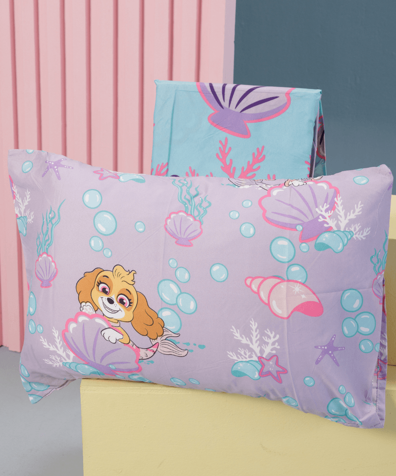 Este encantador jogo de cama infantil inclui um sobrelençol de 1,40x2,20 m e uma fronha estampada de 50x70 cm. A estampa vibrante e lúdica apresenta a adorável Skye em versão sereia, nadando entre conchas, corais e estrelas do mar em um fundo colorido. A fronha em tom lilás claro e o sobrelençol em azul-água vibrante, com detalhes da palavra "Mer Pup", criam um tema aquático envolvente que captura a imaginação das crianças e adiciona um toque de fantasia à decoração do quarto.