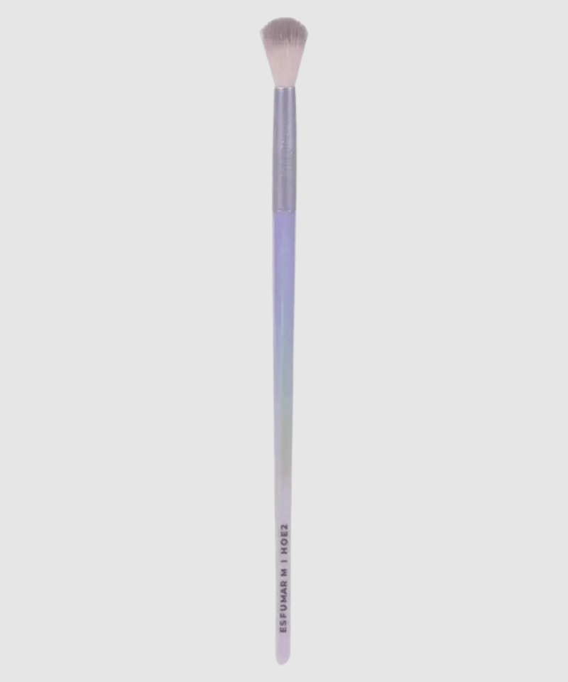Com um design moderno e atraente, o Pincel M Holographic HOE2 se destaca visualmente. Seu cabo cilíndrico apresenta um deslumbrante efeito gradiente iridescente, que transita de tons lilás e azul claro para rosa e roxo vibrantes, complementado por uma ponteira metálica prateada e a inscrição "ESFUMAR M I HOE2". Este pincel de maquiagem profissional não só oferece alta performance e precisão para um esfumado perfeito, mas também é fácil de higienizar, garantindo que você tenha um aliado duradouro para todas as suas necessidades de maquiagem.
