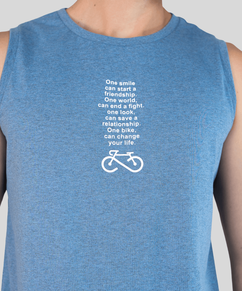 O grande diferencial desta regata masculina motivacional é sua estampa silkada frontal, que apresenta uma poderosa mensagem em inglês sobre superação e conexão, acompanhada de uma estilizada ilustração de bicicleta. A estampa, na cor branca sobre o tecido azul mesclado, faz referência a como "One smile", "One word", "One look" e "One biker" podem iniciar amizades, acabar brigas, salvar relacionamentos e mudar vidas, respectivamente. É a regata com silk bike perfeita para ciclistas e para quem se inspira no movimento e na busca por novos desafios.