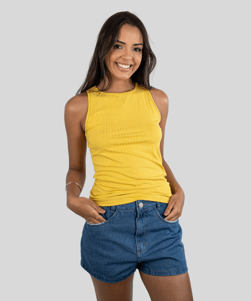 Combine esta regata canelada com shorts, saias ou calças jeans para um look casual. Para um toque mais sofisticado, use-a por baixo de blazers ou cardigãs leves.