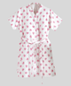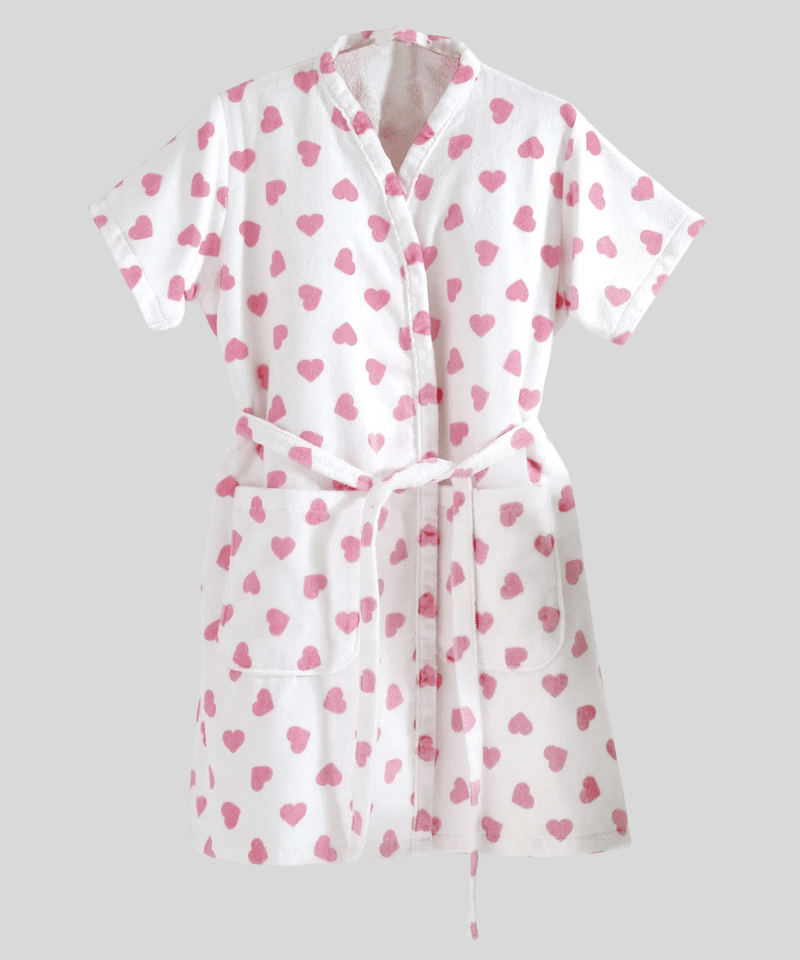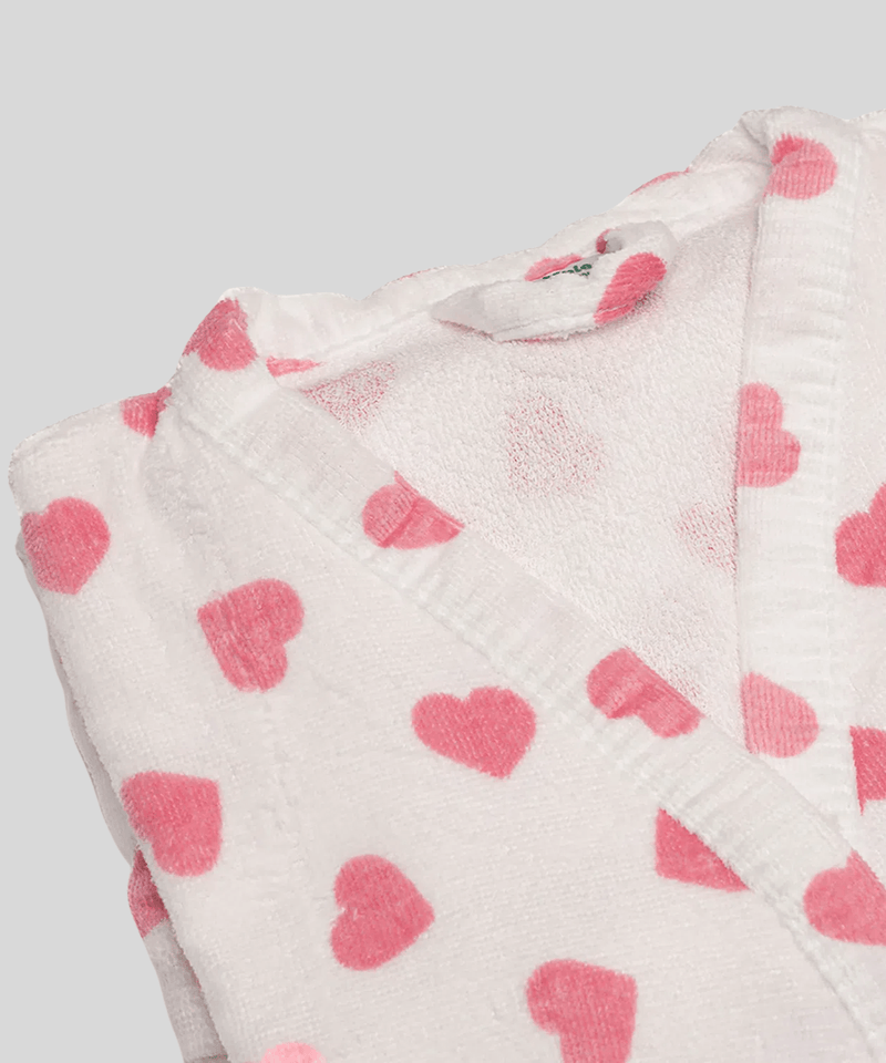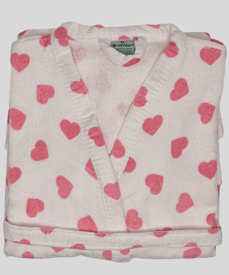 Sua parte externa conta com acabamento velour estampado com delicados corações rosa vibrante, espalhados de forma irregular sobre uma base predominantemente branca, deixando o visual ainda mais charmoso e elegante. A parte interna é totalmente felpuda, proporcionando excelente absorção da umidade. O design inclui uma gola lapela em V macia e arredondada, mangas curtas que se estendem até aproximadamente o meio do braço, e um fechamento frontal com uma fileira vertical de botões brancos redondos. Possui um cinto removível na mesma cor branca e com o mesmo padrão de corações, amarrável na cintura através de passadores laterais, e dois bolsos frontais tipo patch, também com a estampa de corações. O comprimento aparente do roupão se estende acima dos joelhos.