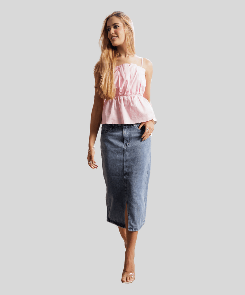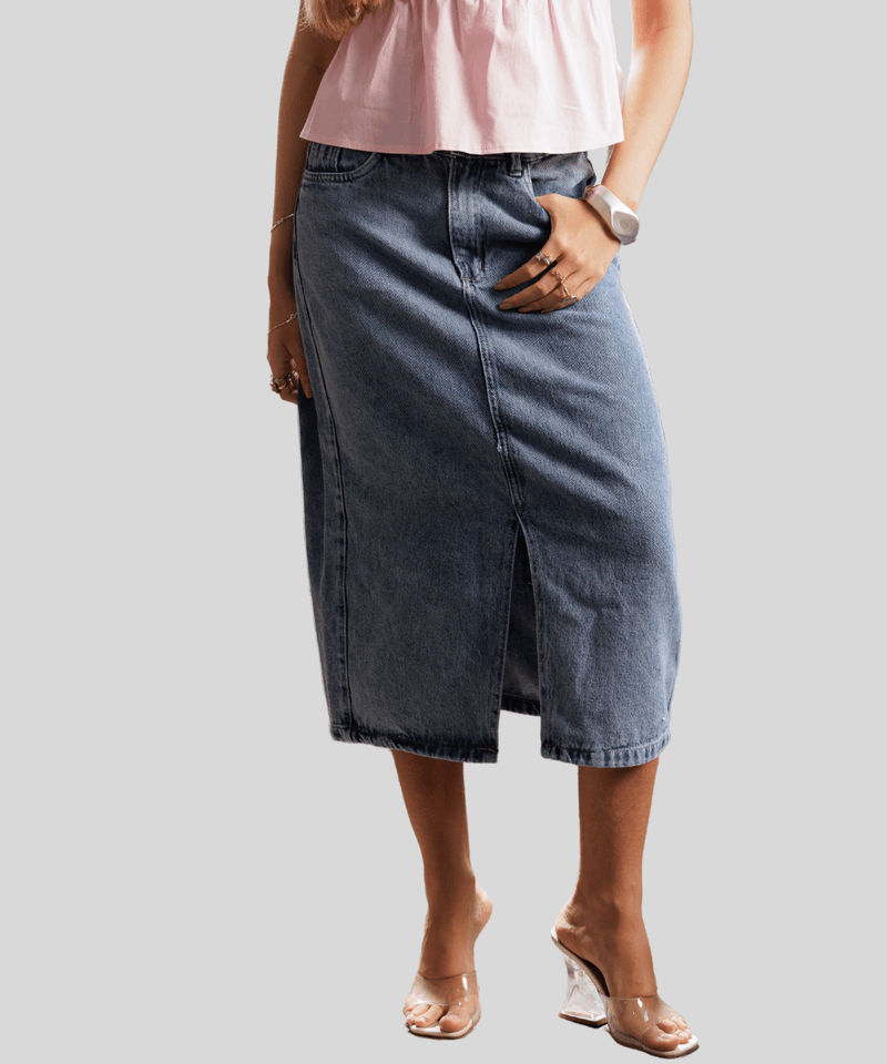 - Combine esta saia midi jeans com tênis para um look casual, ou com saltos e blusas sofisticadas para uma produção mais elegante e urbana.