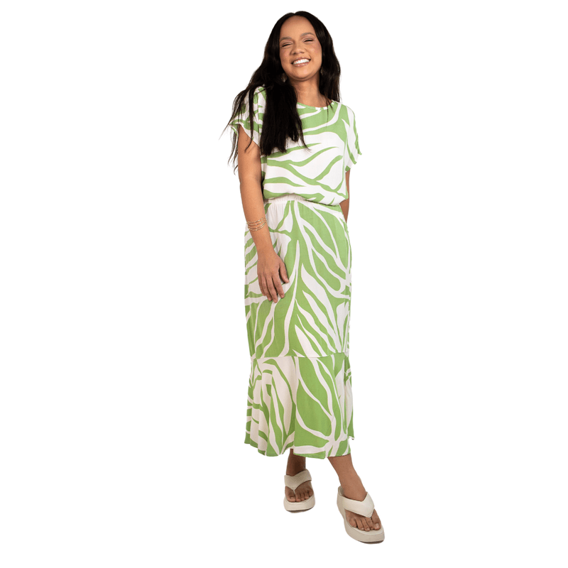 - Combine a saia midi estampada com tênis e uma camiseta para um look casual e confortável, ou com sandálias de salto e uma blusa elegante para uma ocasião mais especial. Experimente também com jaquetas e cardigans para os dias mais frios. Use acessórios como cintos para marcar a cintura e complementar o look.