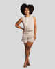 Este short feminino apresenta um design elegante e versátil. Com caimento solto e pregas frontais visíveis, ele proporciona um visual sofisticado e moderno. A cintura alta e o comprimento que se estende até a metade da coxa oferecem um ajuste confortável e favorecedor. O padrão sutil de listras verticais finas e discretas adiciona um charme extra, criando uma aparência coordenada e unificada que pode ser facilmente combinada com outras peças do seu guarda-roupa.