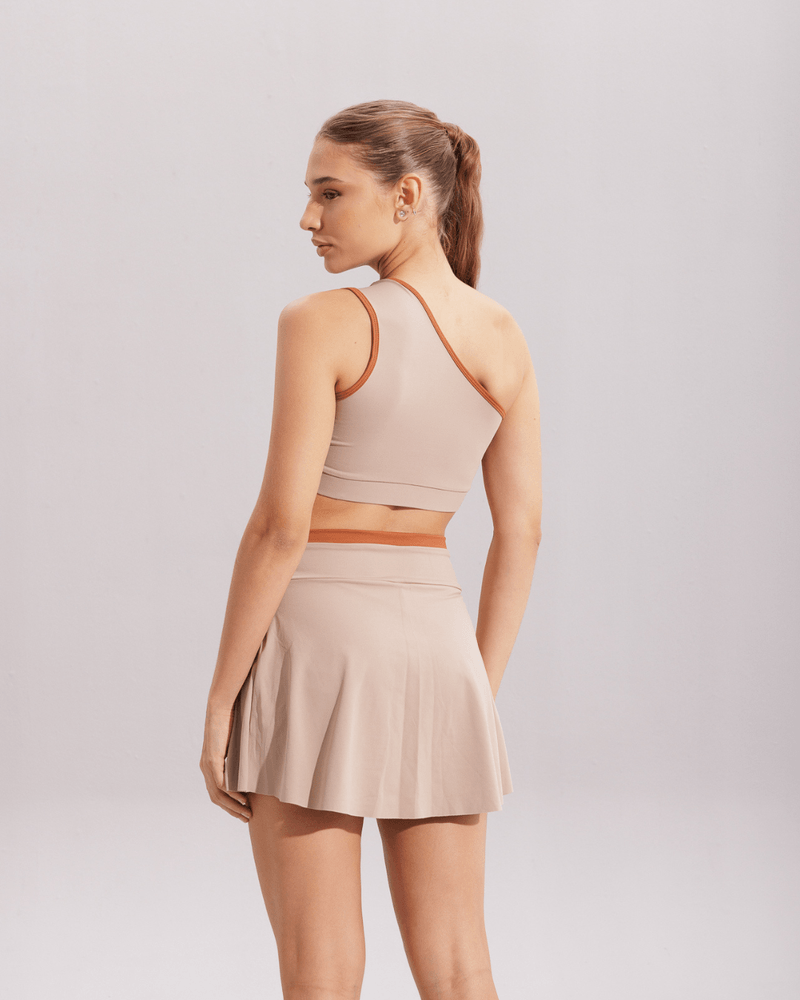 • Cores Coordenadas: disponível nas combinações Ferrugem com detalhe Nude e Nude com detalhe Ferrugem, ideais para formar conjuntos impecáveis com os tops da mesma linha.