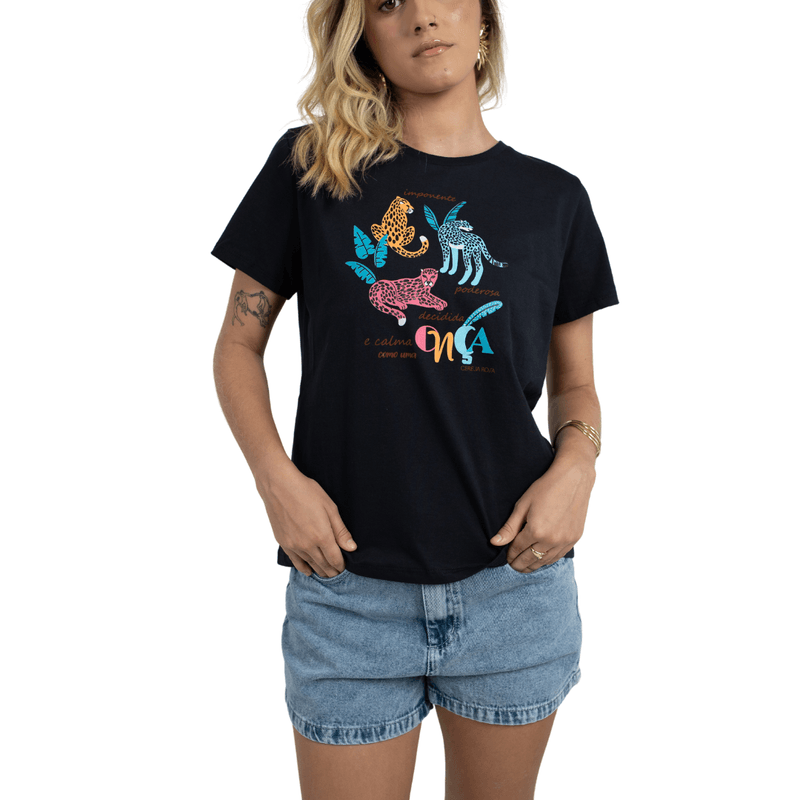 T-shirt Feminina Gola Careca Com Estampa Central de Onça