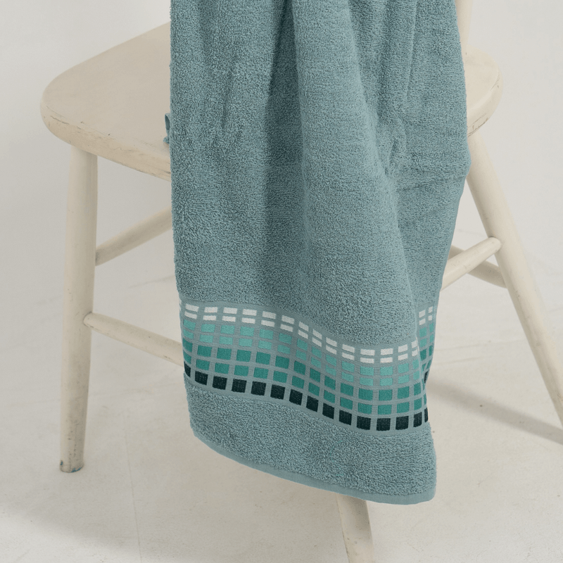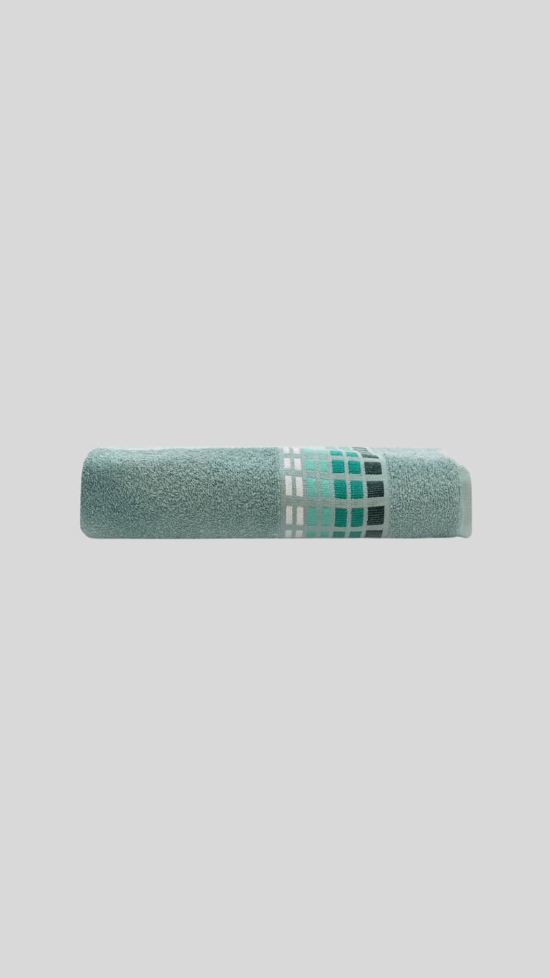 Parte da coleção Mixer, esta toalha se destaca por seu design versátil e pela textura visivelmente macia. As imagens do produto revelam uma paleta de cores sofisticada, incluindo tons como rosa empoeirado, azul-petróleo escuro e verde-menta claro, cada um com uma faixa central decorativa de padrão quadriculado em diferentes tonalidades. As bordas com acabamento de bainha bem definido reforçam a qualidade e durabilidade do produto, ideal para o uso diário.